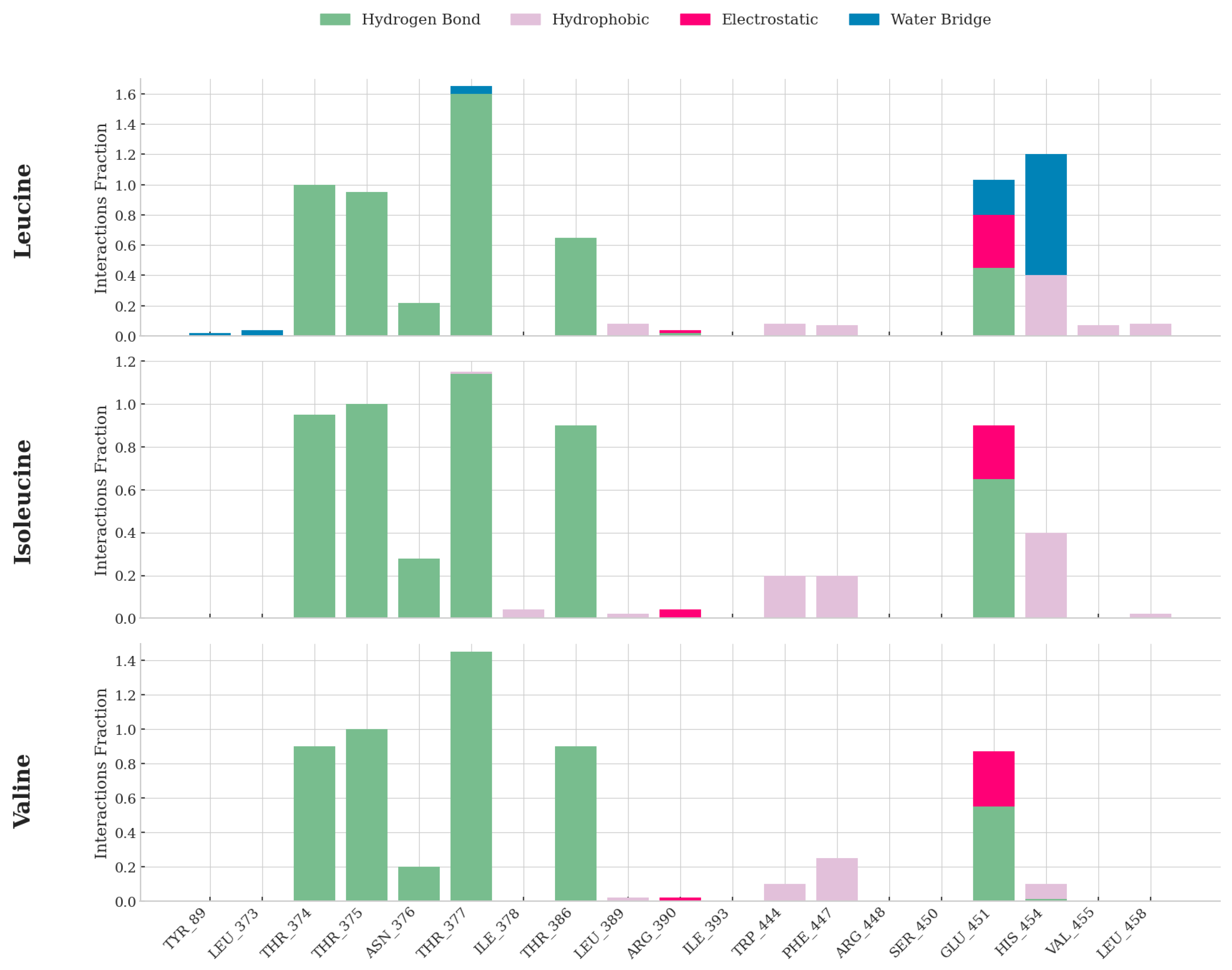 Quantitative Analysis of Protein–Ligand Interactions Throughout MD Simulations. Interaction fraction plots showing the percentage of simulation time that specific interactions—hydrogen bonds (green), hydrophobic contacts (purple), electrostatic interactions (red), and water bridges (blue)—are maintained between SESN2 residues and each bound ligand. The data demonstrates that leucine forms the most extensive, diverse, and persistent set of interactions, providing an atomic-level explanation for its superior binding affinity.