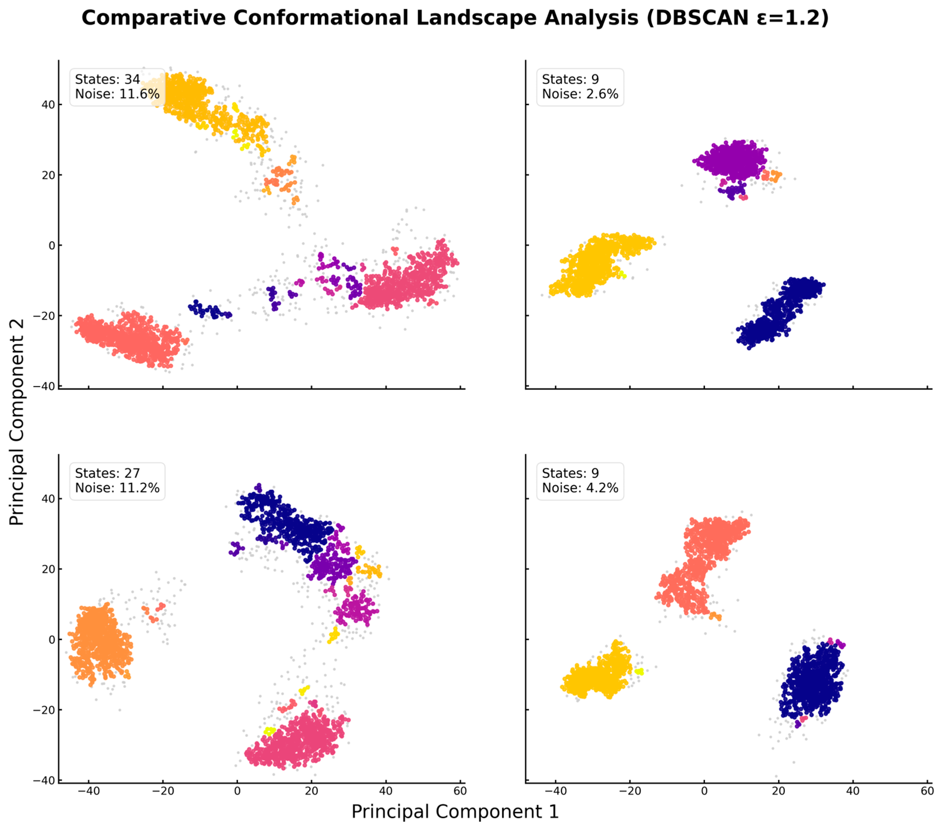 Quantitative Clustering of Conformational Landscapes via DBSCAN Analysis Reveals Ligand-Induced Collapse. Projection of the Cα atom trajectories onto the first two principal components (PC1 and PC2), with distinct colors in each panel representing unique stable conformational states identified by the clustering algorithm, and gray points representing transitional noise. (Top-Left) The apo-protein explores a vast landscape, sampling 34 distinct states with significant time (11.6%) in transitional conformations. (Top-Right) Leucine binding induces a dramatic collapse, restricting the protein to just 9 well-defined states and minimizing time spent in transitions (2.6% noise). (Bottom-Left) The isoleucine-bound form remains conformationally heterogeneous, similar to the apo state (27 states). (Bottom-Right) Valine binding also restricts the landscape to 9 stable states. In each panel, distinct colors represent unique stable conformational clusters, while gray points represent transitional “noise” conformations that do not belong to any stable state. This analysis provides direct, quantitative evidence of the “conformational locking” mechanism driven by leucine and valine.
