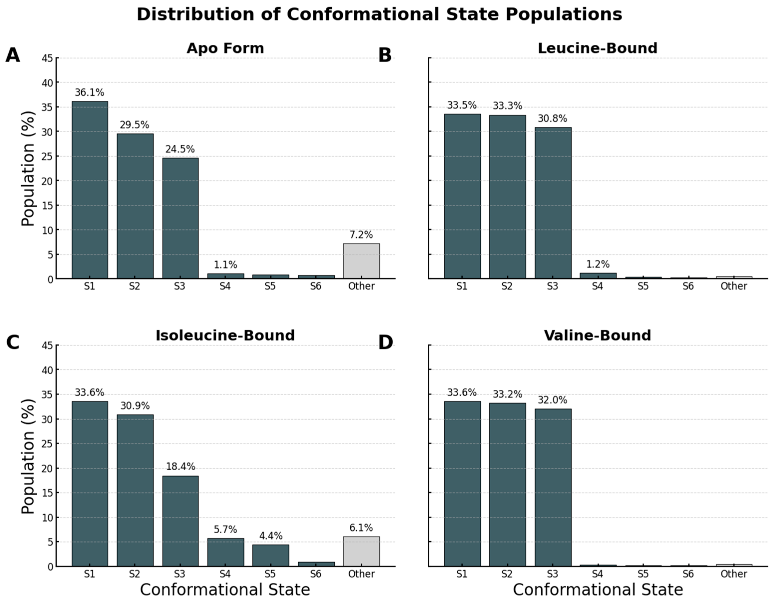 Quantitative Population Analysis of Conformational States. Distribution of conformational state populations identified by DBSCAN clustering of the trajectories projected onto PC1 and PC2. In all panels, dark grey bars represent distinct stable macrostates (S1–S6), while the light grey “Other” bar aggregates the remaining low-population microstates and transitional noise. (A) The Apo form exhibits a broad distribution, with a large “Other” population (7.2%), consistent with high entropy. (B) Leucine binding consolidates the ensemble into three dominant states (S1–S3). (C) The Isoleucine-bound system retains significant heterogeneity, similar to that of the apo form. (D) Valine binding mirrors the leucine effect, showing a stabilized landscape dominated by three major states. These data provide quantitative evidence that leucine and valine drive a conformational locking mechanism, whereas isoleucine fails to stabilize a specific, distinct conformation.