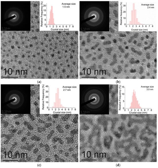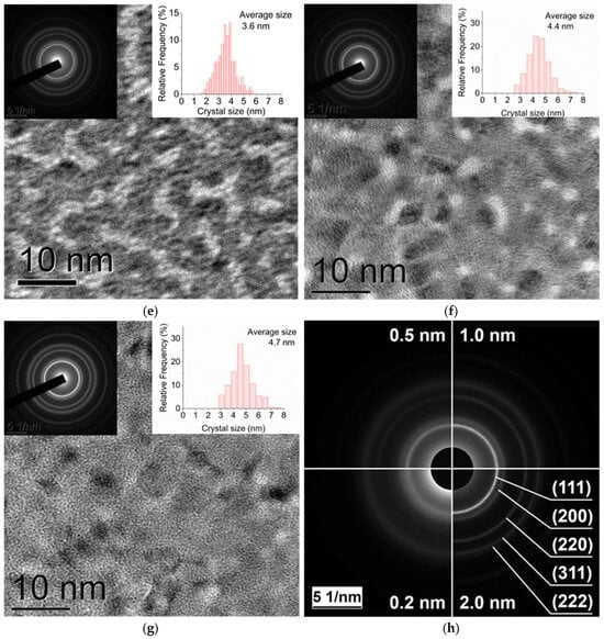 The morphology and phase composition of the films were studied by TEM and selected area electron diffraction (SAED), using a JEOL (Tokyo, Japan) JEM-2100 (LaB6) at an accelerating voltage of 200 kV. Heating the thin-film samples directly in the electron microscope column allowed for studying the effect of temperature on the morphology and phase composition of the films. The conditions and features of in situ studies with heating in the TEM column are described in detail in our previous papers devoted to the study of solid-state reactions initiated by thermal heating in various thin-film systems: Al/Pt [85,86], Al/Au [87], Al/Ag [88], Al/Cu [89,90], Al/Fe [91], Fe/Pd [86,92], Cu/Au [93], Cu/Si [94], Co-ZrO2 [95], Al/a-Si [96], and a-Si crystallization [97].