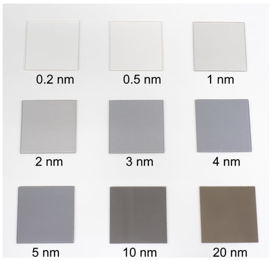 A series of Pt films with thicknesses of 0.2–20 nm was obtained in order to investigate the dependence between the Pt film thickness and transmission spectra. The general layout of the obtained platinum films with various thicknesses is presented in Figure 3.