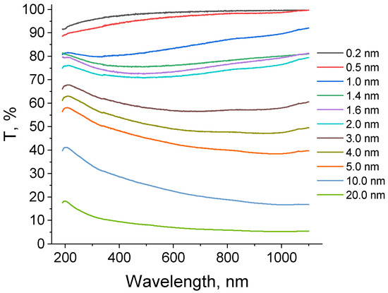 Figure 4 presents the transmission spectra of the platinum thin films with different thicknesses in a range of 190–1100 nm, with the corrections made taking into account the absorption by the quartz substrates.