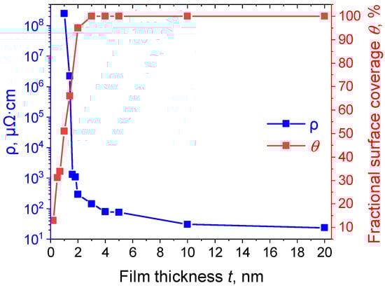 The percolation threshold (the thickness at which the film becomes conductive) in the platinum films is determined to be reached upon achieving a thickness of 1.0 nm, which is in good agreement with the data obtained earlier, namely 0.83 nm in [63] and 1.3 nm in [65]. In this case, the value of the electrical resistivity for a film thickness of 1.0 nm is equal to ρ = 2.52∙108 μΩ∙cm. Witssh an increase in the film thickness and, consequently, in the fractional surface coverage, one can observe an abrupt decrease in electrical resistivity (see Figure 5) to a thickness of 3.0 nm (ρ = 142.8 μΩ∙cm), which is due to the changes in the film morphology. As shown in Section 2.1.2, at a thickness of 3.0 nm, the films become continuous. Moreover, with the film thickness exceeding 3.0 nm, the size of the crystallites changes only insignificantly, resulting in a slight decrease in the electrical resistivity. The value of the electrical resistivity ρ = 30.6 μΩ∙cm for the films with a thickness of 10 nm is in good agreement with the data obtained in other studies (ρ = 43.5–72.5 μΩ∙cm [12,13]). In addition, the electrical resistivity of the platinum films with a thickness of 20 nm ρ = 23.6 μΩ∙cm is comparable to the values typical for platinum in the bulk state (ρ = 10.5 μΩ∙cm at 20 °C [69]).