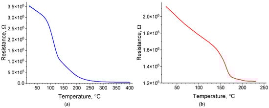 As can be seen from Table 2, the calculated dissociation temperature of platinum oxides under high vacuum conditions at a pressure of 1 × 10−6 Torr (112 °C) corresponds to the region of a sharp decrease in electrical resistance when heating the films in a vacuum (see Figure 6a). However, in the case of heating in air, the heating temperature is insufficient (≤430 °C, see Table 2) for the dissociation of oxides, which leads to the resistance decreasing less significantly in this case.