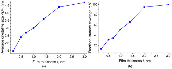 The analysis of the data obtained by TEM (see Table 1) shows that the dependence of the crystallite size and the fractional surface coverage on the Pt film thickness has a power-law character (Figure 7a,b), which, in turn, suggests the presence of scaling during the growth of the Pt films. According to the model by Blackman and Wilding [74], the dependences of the fractional surface coverage θ, average crystallite size <D>, and island density N on the film thickness t can be described with the power functions: θ~tα, <D>~tβ, and N~tγ. Here, the analysis of the power coefficients α, β, and γ can be used to obtain information about the film growth mode.