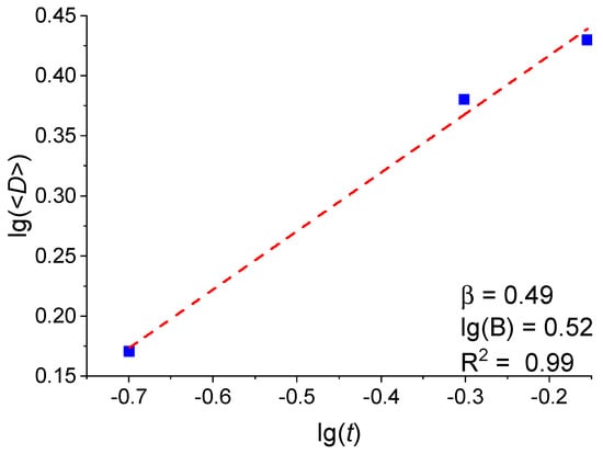 To analyze the average crystallite size and island density, use was made of the data obtained from the films with thicknesses of 0.2, 0.5, and 0.7 nm, since isolated islands are observed only at these thicknesses. Figure 9 shows the dependence of the average crystallite size <D> on the Pt film thickness t in logarithmic coordinates. As is seen in Figure 9, the experimental data are well described by the power function <D> = Btβ, where β = 0.49 and B = 3.31. Here, β shows how efficiently the crystallite size grows with the increasing film thickness. B is a constant, depending on the fabrication method.