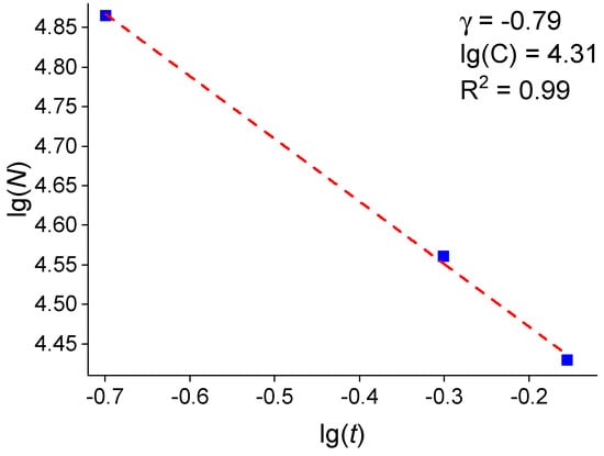 Figure 10 presents the dependence of the island density N on the Pt film thickness t in logarithmic coordinates. As is seen in Figure 10, the experimental data are well described by a power function N = Ctγ, where C = 20,417 and γ = −0.79. Here, γ shows how efficiently the island density increases with an increasing film thickness, and C is a constant, depending on the fabrication method.
