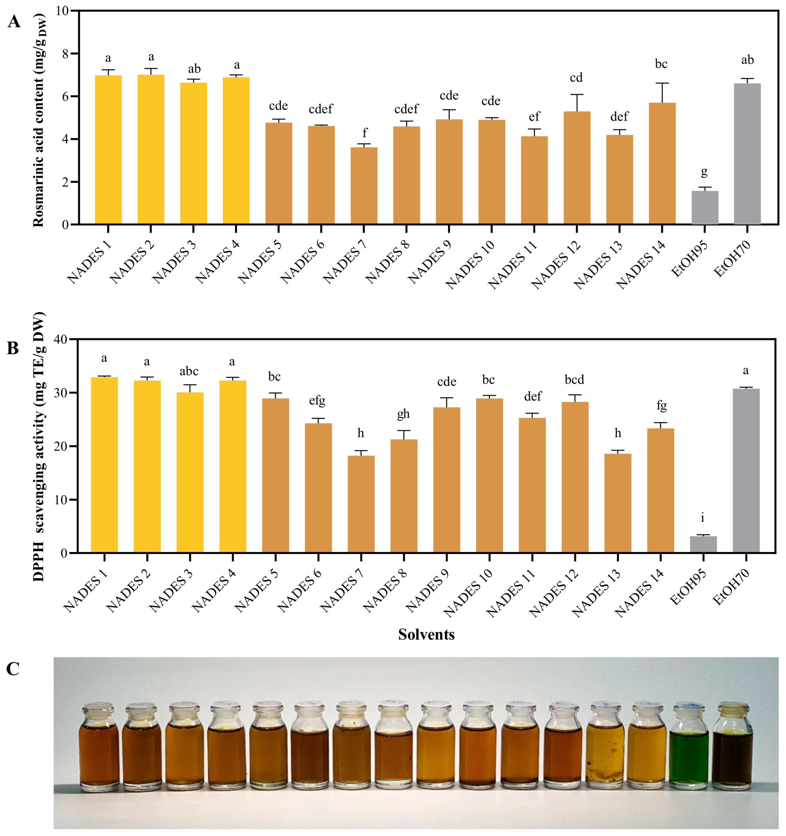 2.1. The Suitable NaDES Combination for Ultrasonic-Assisted Extraction of T. laurifolia Was Determined by Rosmarinic Acid Content and DPPH Scavenging Activity