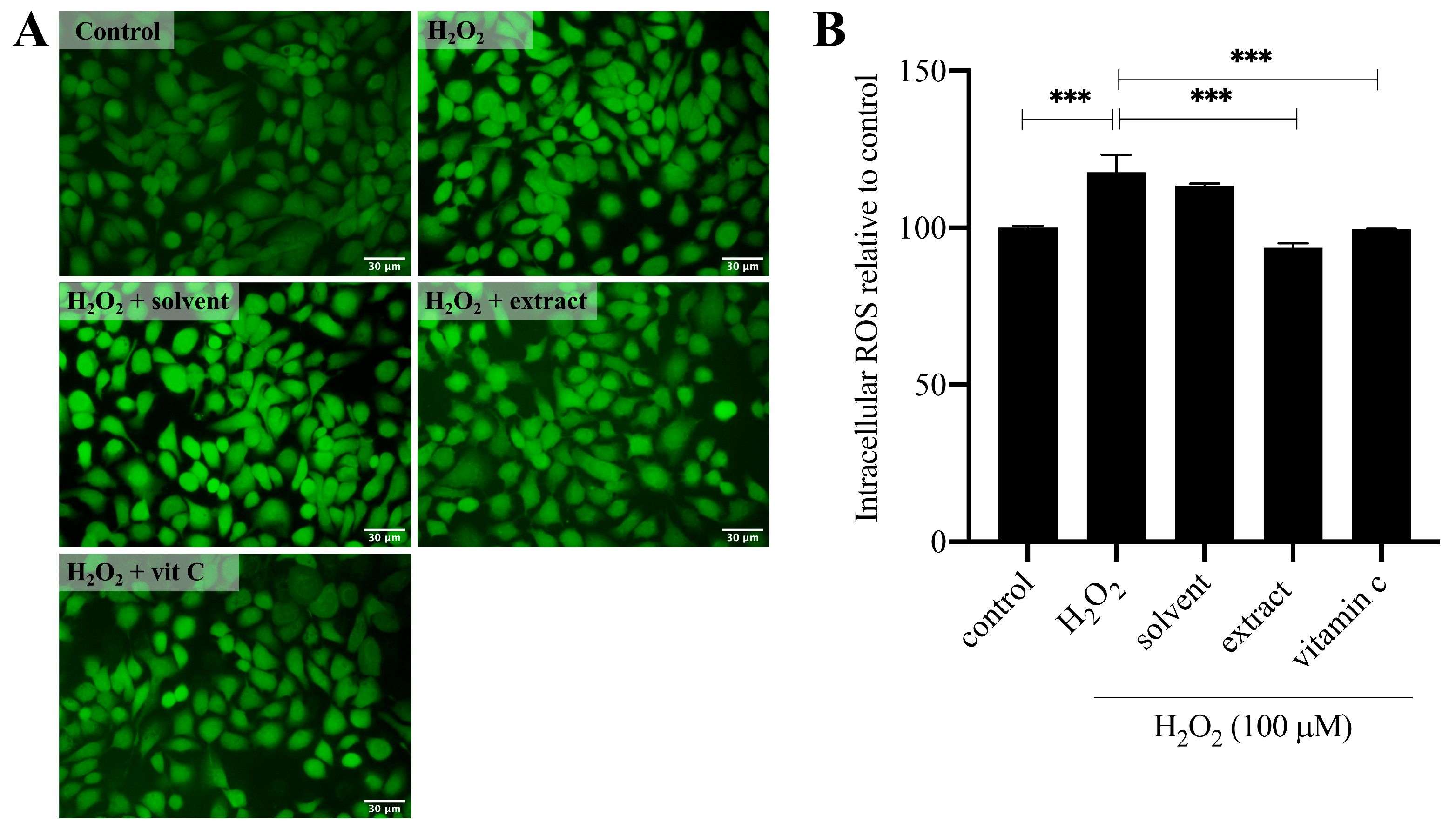 2.4. NaDES-Assisted T. laurifolia Extract Suppresses H2O2-Induced Intracellular ROS Production