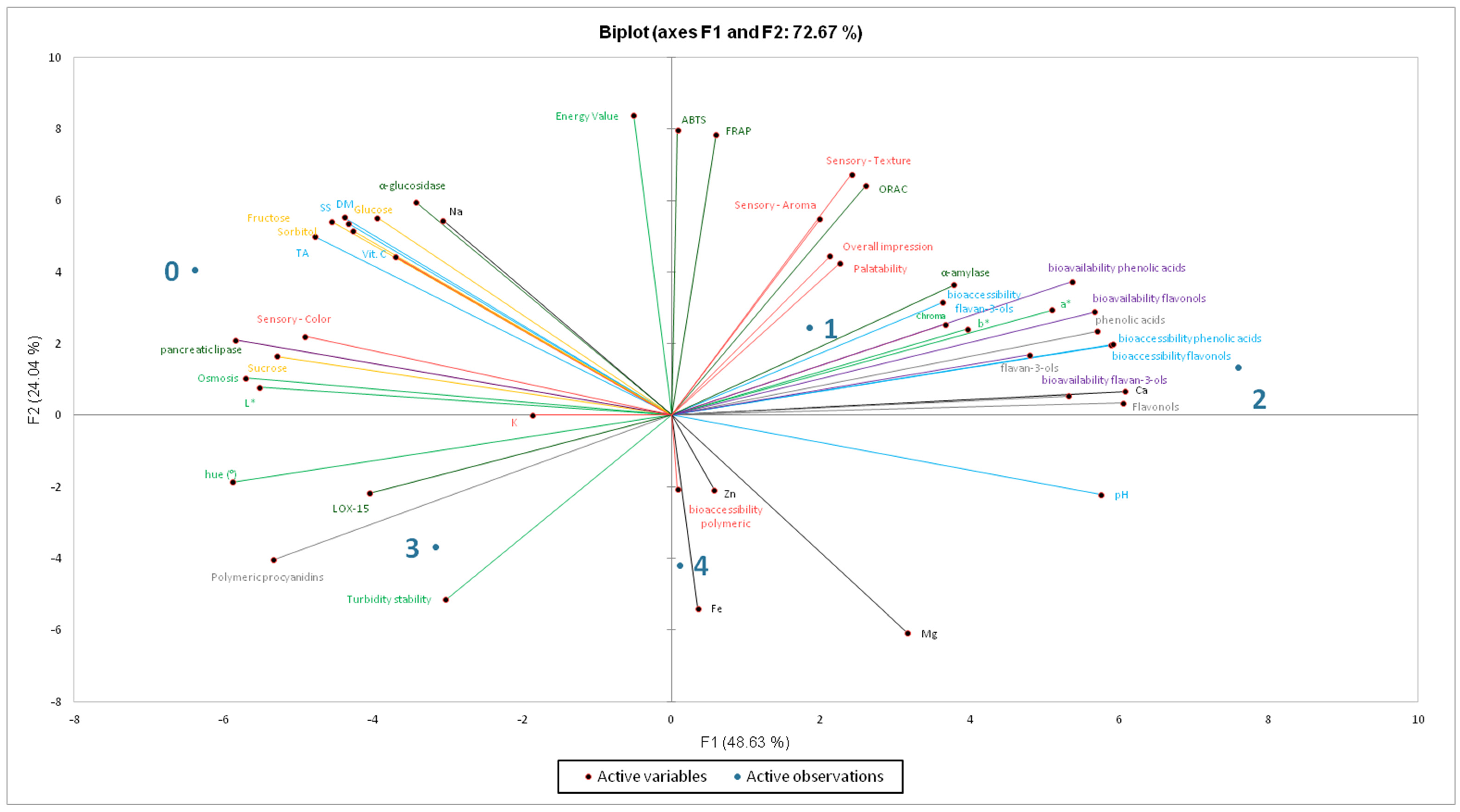 - Nowicka, P.; Wojdyło, A.; Laskowski, P. Principal component analysis (PCA) of physicochemical compounds’ content in different cultivars of peach fruits, including qualification and quantification of sugars and organic acids by HPLC. Eur. Food Res. Technol. 2019, 245, 929–938. [Google Scholar] [CrossRef]
