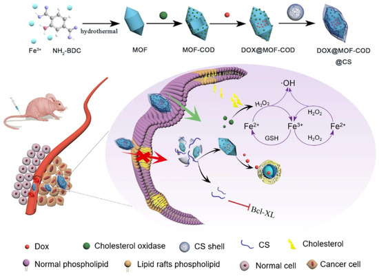 P-gp was also inhibited by CS-coated MOFs immobilizing cholesterol oxidase (COD), which catalyzes cholesterol consumption and generates hydrogen peroxide (H2O2). The subsequent peroxidase-like activity converts H2O2 into highly toxic hydroxyl radicals (•OH), thereby inducing cancer cell apoptosis and reversing drug resistance. In vivo, this strategy led to a marked reduction in P-gp activity, with DOX efflux decreasing from 54% for free DOX to 28% for DOX-loaded MOFs (Figure 4) [74].