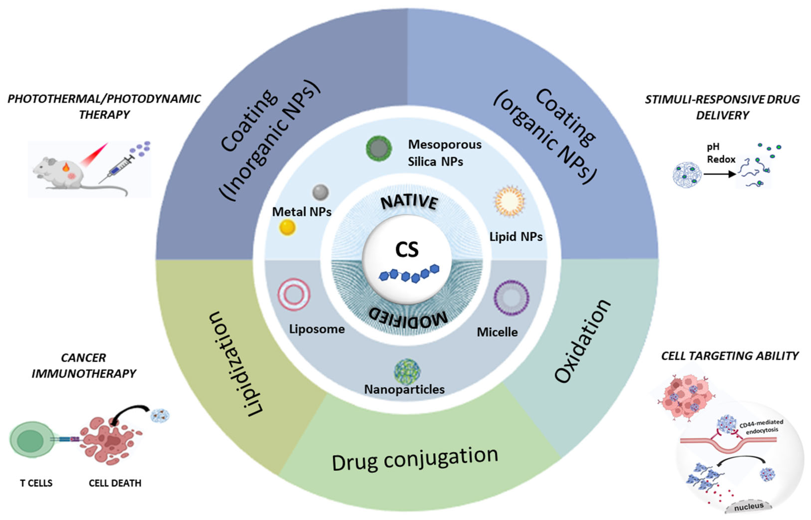 | CS | LyP-1-PC | Electrostatic interaction | PTX CTS | Breast | 4T1 | 4T1 Orthotopic | CD44 targeting Immunotherapy | [60] |