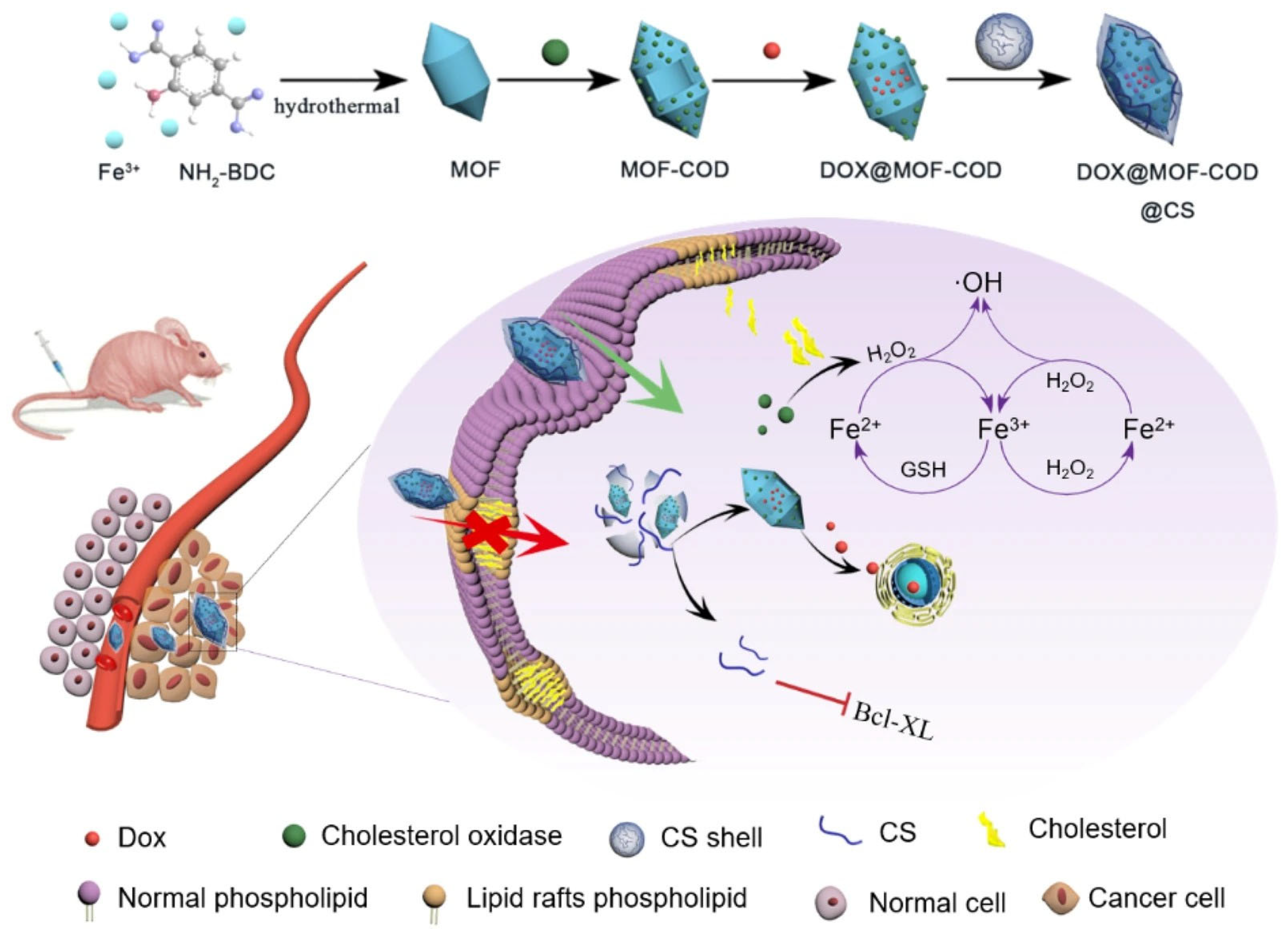 | CS | MOF-COD | EDC coupling | DOX COD | Breast | MCF-7/ADR | MCF-7/ADR Orthotopic | CD44 targeting Chemo sensitization | [74] |