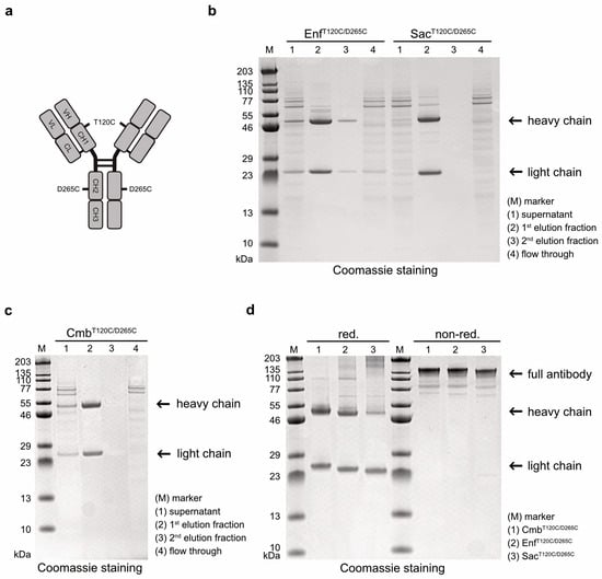 Antibody variants targeting EGFR, Nectin-4, and TROP-2 were generated by cloning the VH and VL domains of Cetuximab (Cmb), Enfortumab (Enf) and Sacituzumab (Sac), respectively, into human hIgG1 heavy- and light-chain expression vectors carrying cysteine mutations at positions T120 and D265 in the heavy chain (Figure 1a). After expression in Expi293T cells and purification by affinity chromatography, the cysteine-modified antibodies CmbT120C/D265C, EnfT120C/D265C, and SacT120T/D265C were analyzed by SDS-PAGE. All antibodies were detected in the first elution fraction (Figure 1b,c). Under reducing conditions, the expected ~49–50 kDa heavy chains and ~23 kDa light chains were observed, whereas under non-reducing conditions, intact antibodies with a molecular weight of ~145 kDa were detected (Figure 1d). This proved that all antibody variants were correctly assembled as full-length IgG molecules in our expression system.