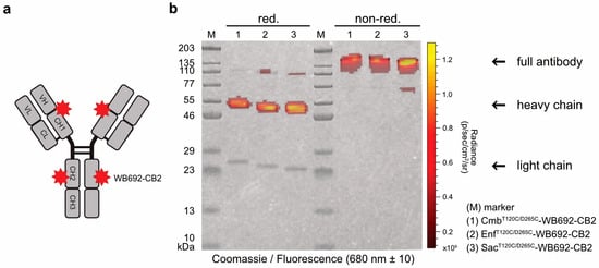 (a) Graphical representation of the antibody-dye conjugates carrying cysteine-coupled WB692-CB2 dyes. (b) Overlay of Coomassie-stained SDS-PAGE gels of the conjugates under reducing and non-reducing conditions, visualized under white and red light (680 ± 10 nm).