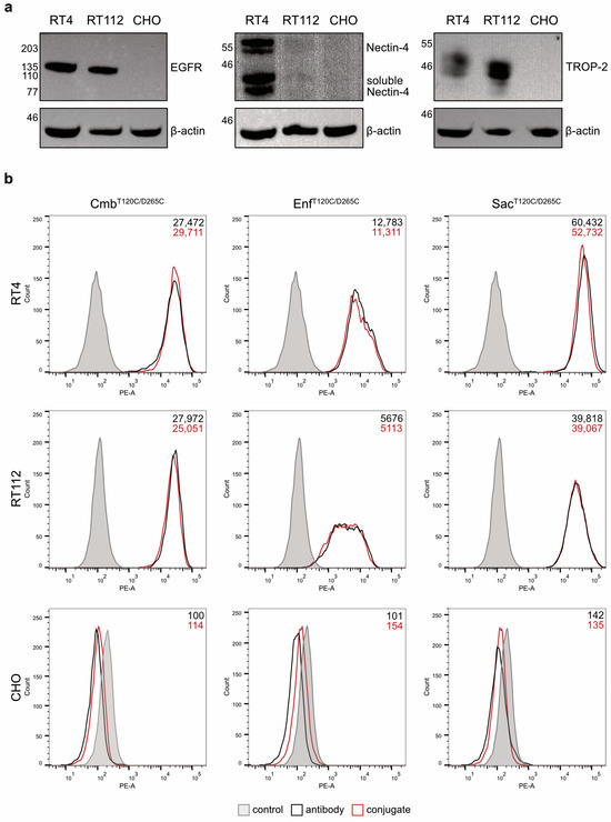 (a) Western blot analysis of EGFR, Nectin-4, and TROP-2 expression in the BC cell lines RT4 and RT112 and in the antigen-negative control cell line CHO. (b) Cell binding of the antibodies and conjugates to the target cells as demonstrated by flow cytometry. Binding of the isotype control antibody is shown in gray.