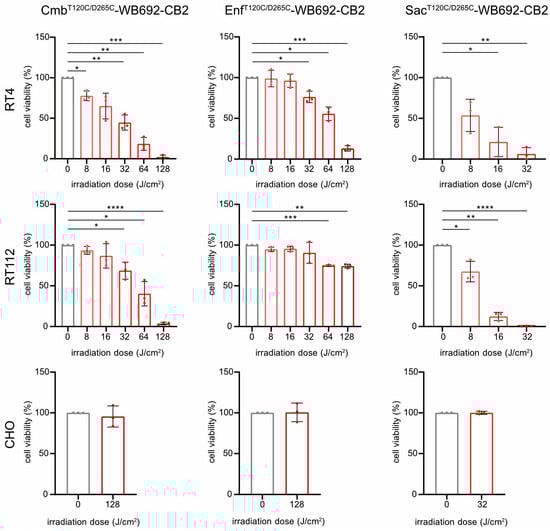 Cytotoxicity of the conjugates CmbT120C/D265C-WB692-CB2, EnfT120C/D265C-WB692-CB2, and SacT120C/D265C-WB692-CB2 after irradiation with different light doses in RT4 and RT112 cells. CHO cells served as antigen-negative controls. Mean values ± SD of three independent biological experiments. Statistical analyses were performed using unpaired, parametric Student’s t-tests with Welch’s correction (* p < 0.05, ** p < 0.01, *** p < 0.005, **** p < 0.001).