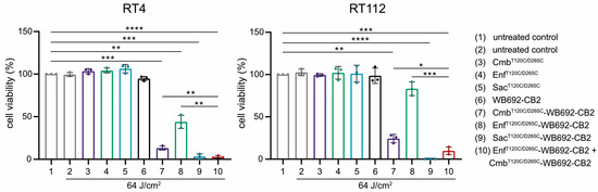 Cytotoxicity of the conjugates CmbT120C/D265C-WB692-CB2, EnfT120C/D265C-WB692-CB2 and Sac120T/265C-WB692-CB2 alone and in combination after irradiation with a light dose of 64 J/cm2 in RT4 and RT112 cells. Control samples were treated with the uncoupled antibodies or the free dye. Mean values ± SD of three independent biological experiments. Statistical analyses were performed using unpaired, parametric Student’s t-tests with Welch’s correction (* p < 0.05, ** p < 0.01, *** p < 0.005, **** p < 0.001).