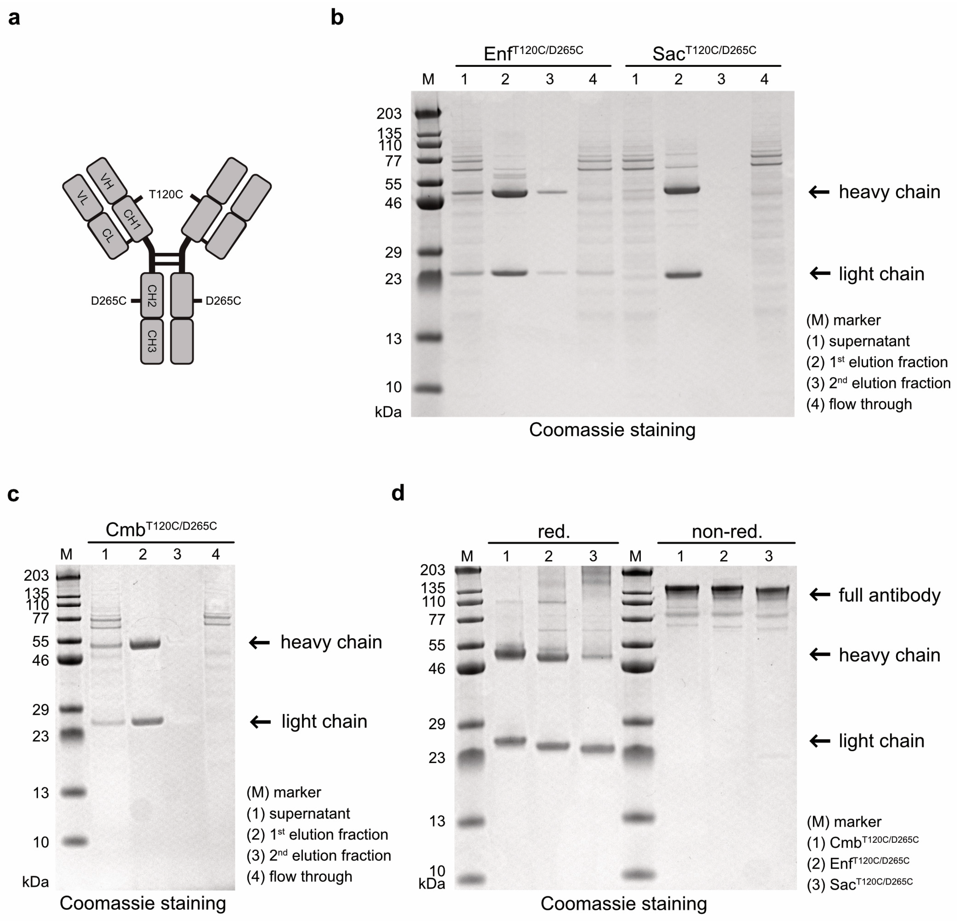 T120T/D265C were analyzed by SDS-PAGE. All antibodies were detected in the first elution fraction (