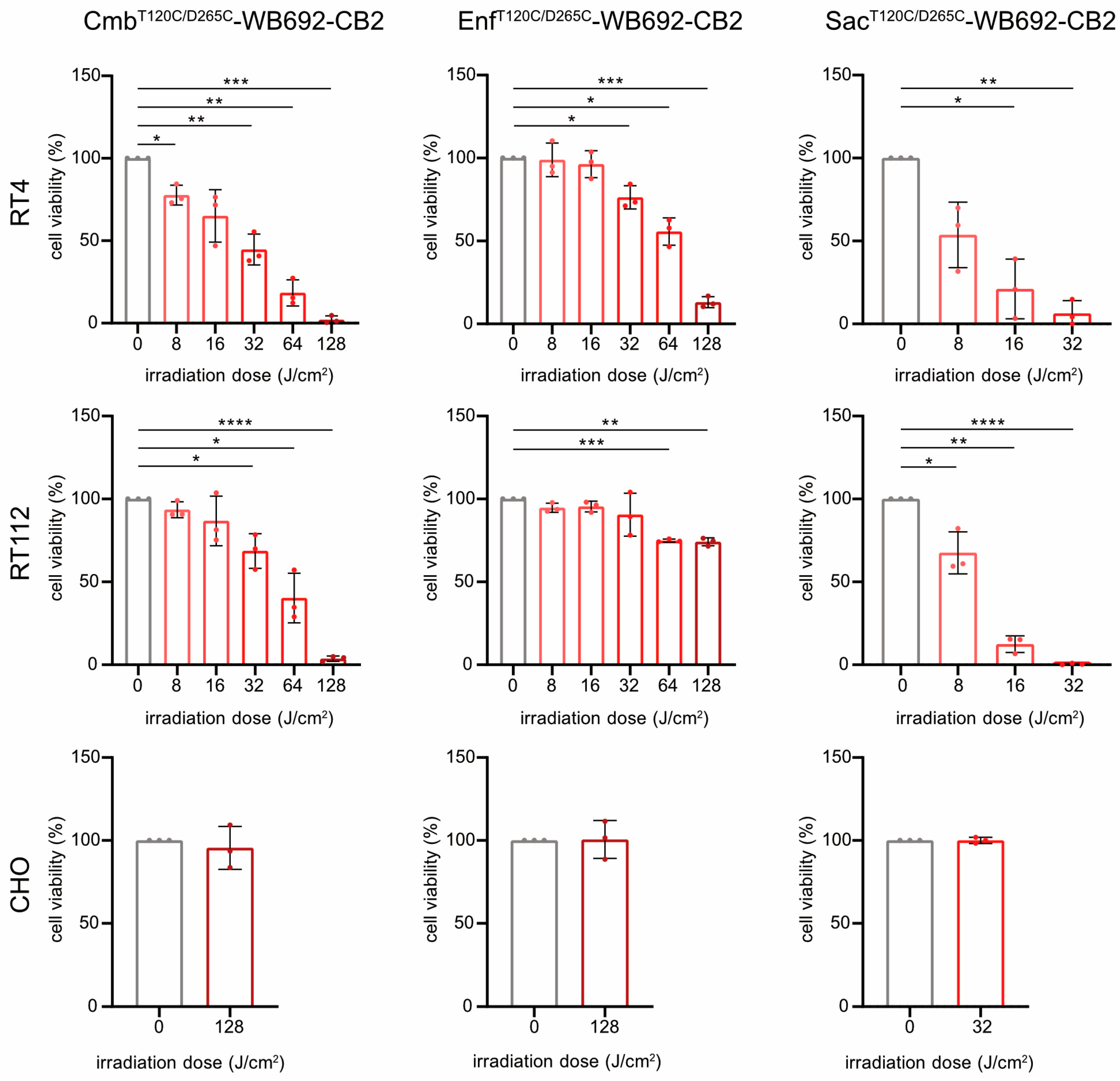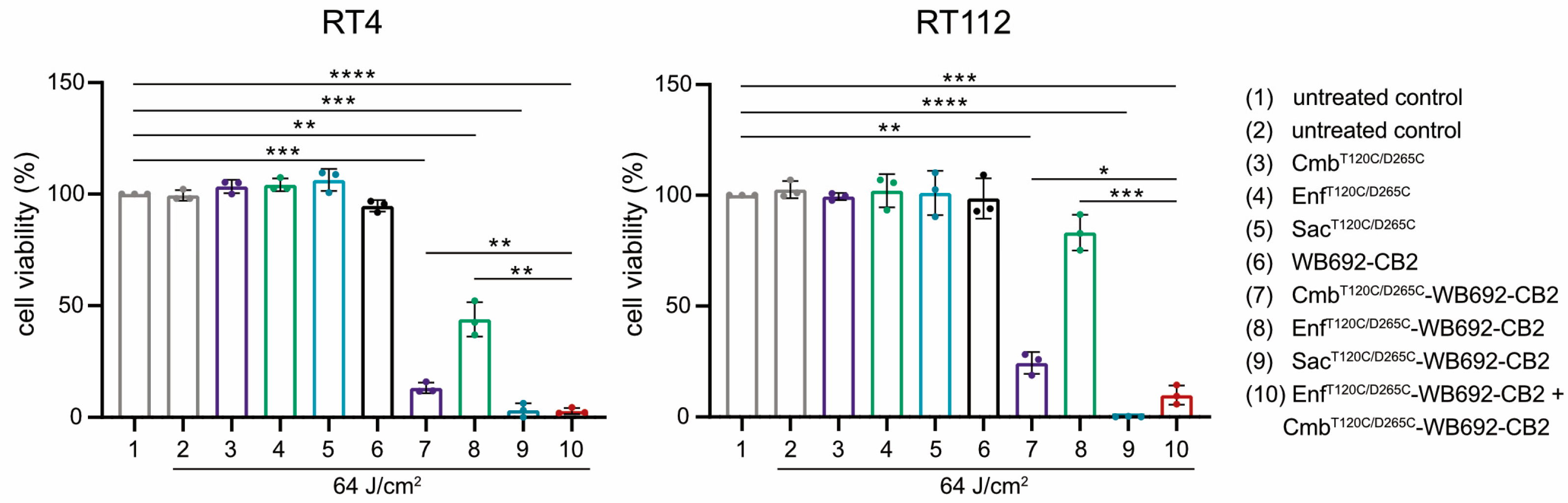 T120C/D265C-WB692-CB2 significantly reduced RT4 cell viability to 6.3 ± 7.6% and completely eradicated RT112 cells at a light dose of 32 J/cm
