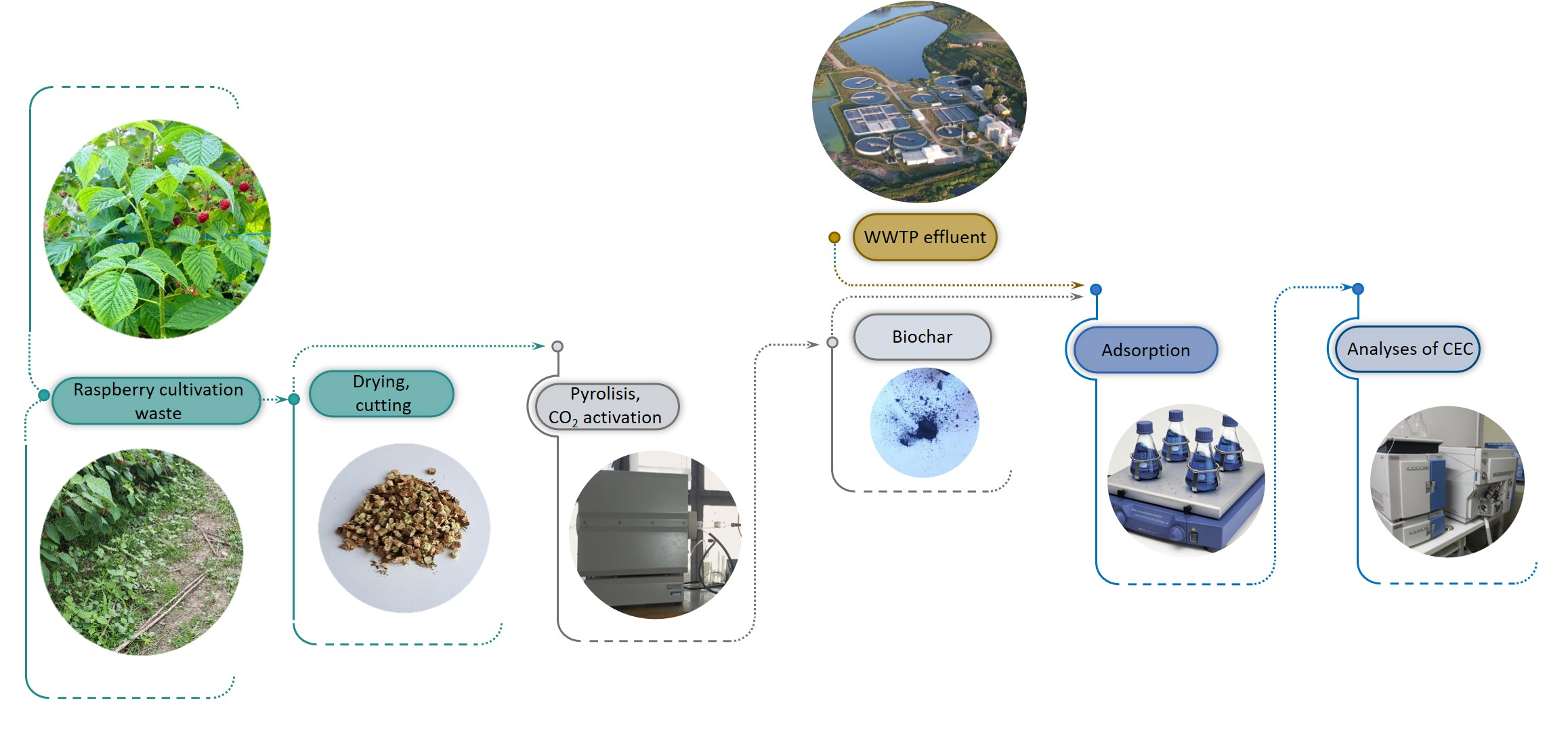 | Raspberry-based biochar | 700 °C, 2 h CO2 activated SBET 450 m2/g | Carbamazepine | ~5 min | WWTP effluent (1467–4566 ng/L) Dose: 1 g/L, Original pH | 100 | This study |