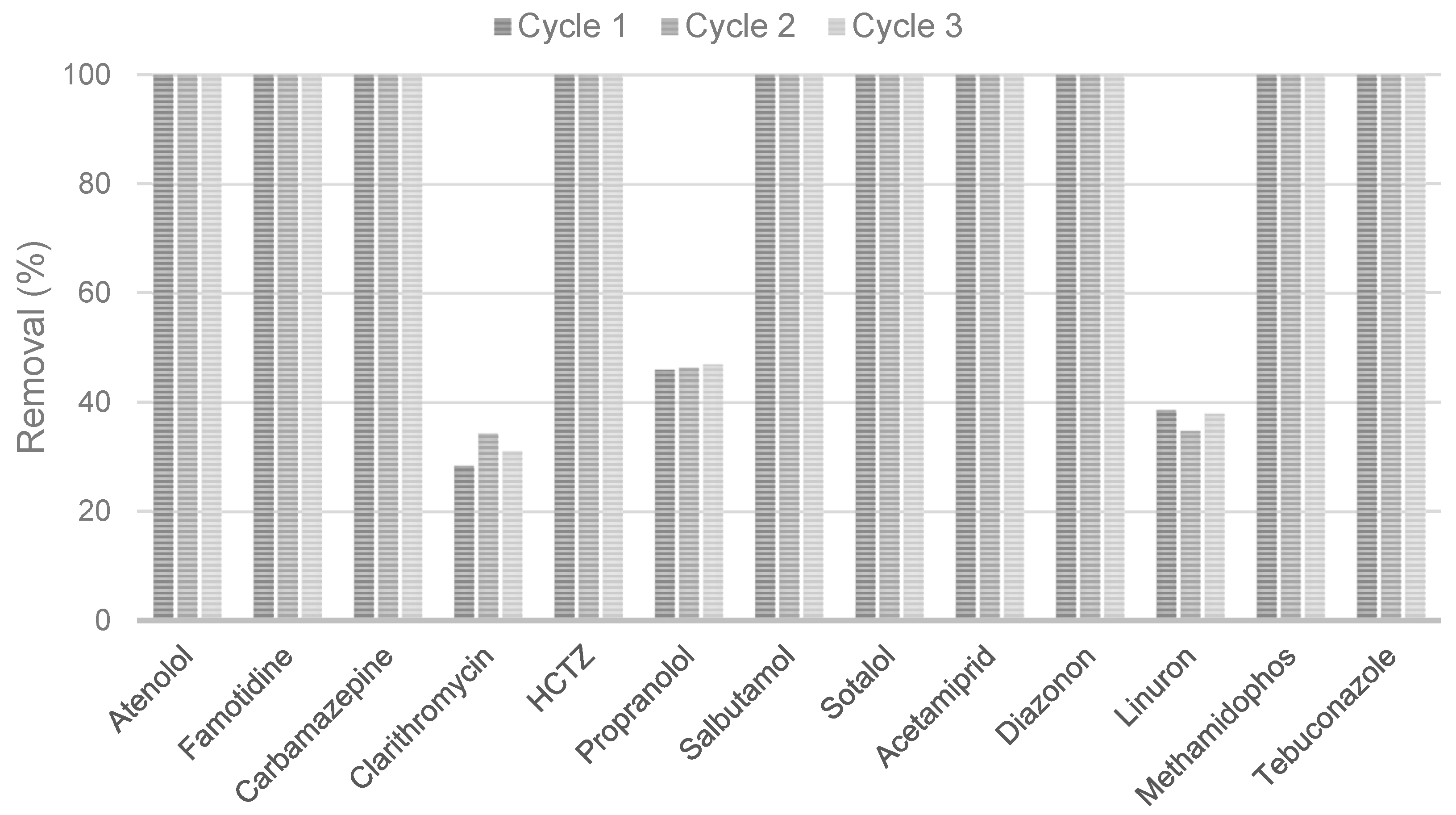 | CEC | Campaign II C0, (ng/L) | Removal (%) * | Campaign III C0, (ng/L) | Removal (%) * |