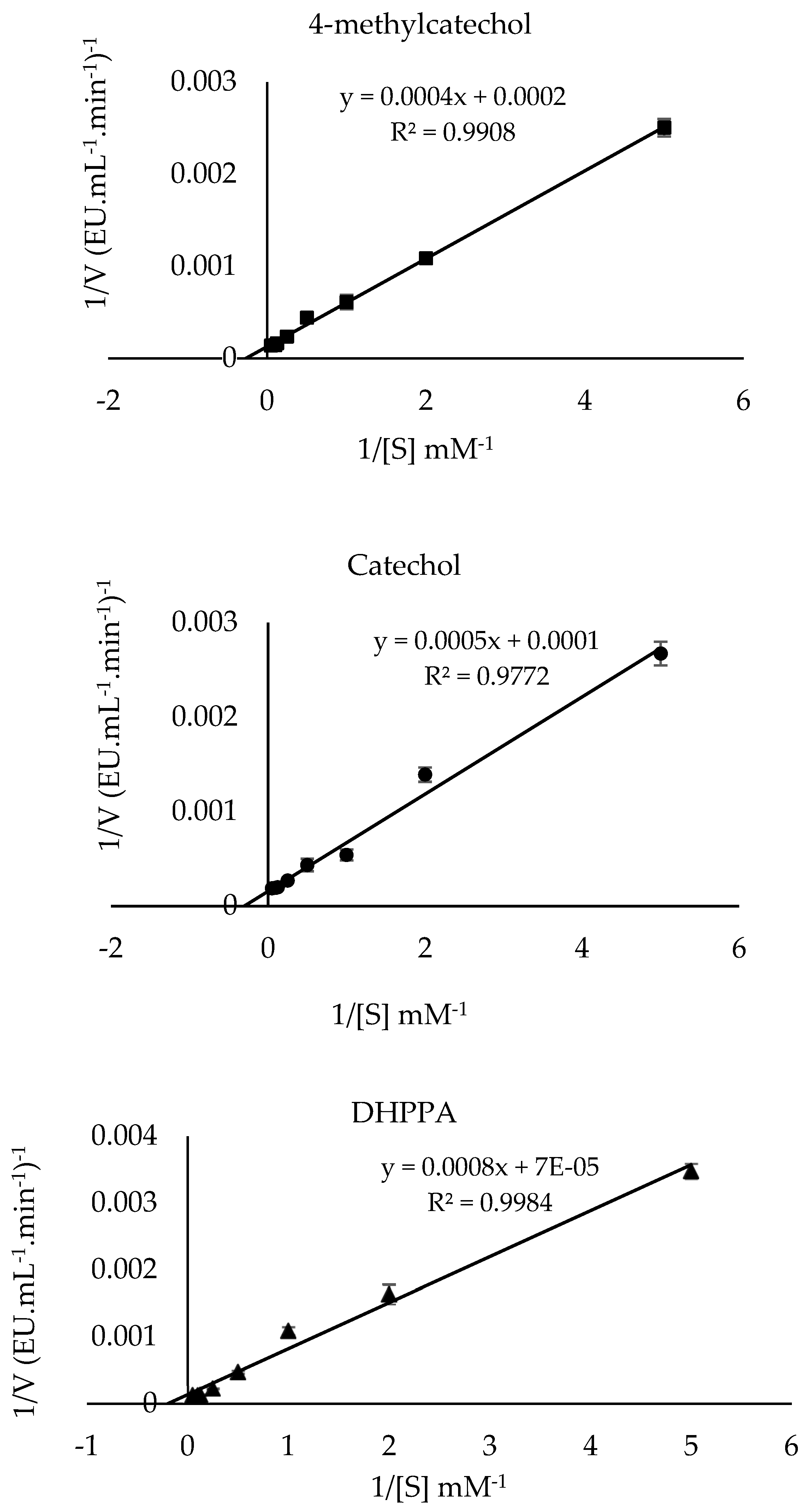 | 4-Methylcatechol | 4.75 ± 0.66 | 2333.33 ± 288.68 | 492.06 ± 13.75 | ||