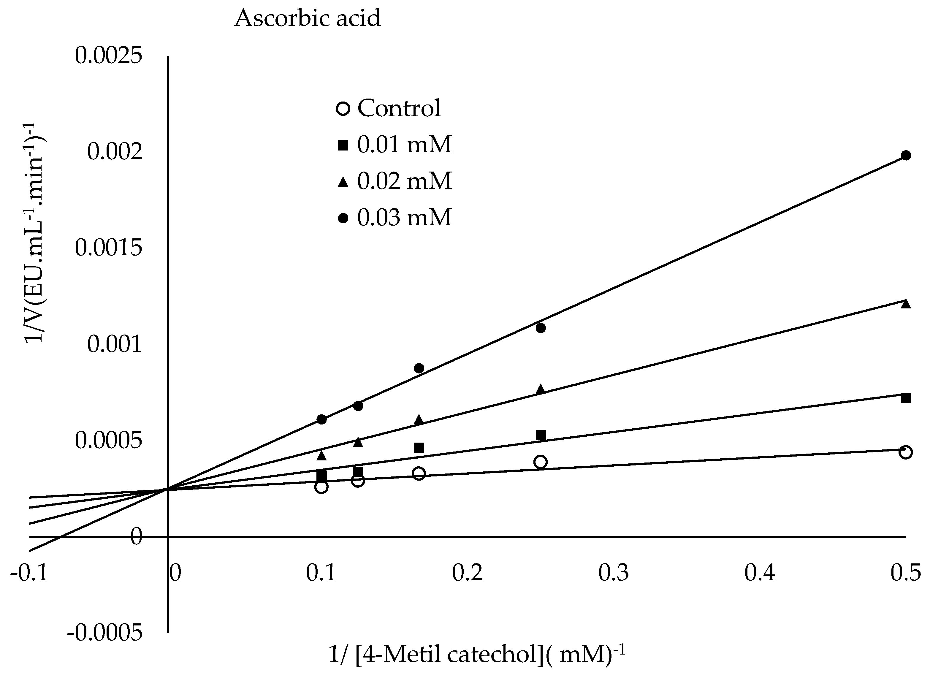 | Sarali plum | 4-Methylcatechol | Ascorbic acid | 0.038 ± 0.001 | 0.0095 | Competitive | [39] |