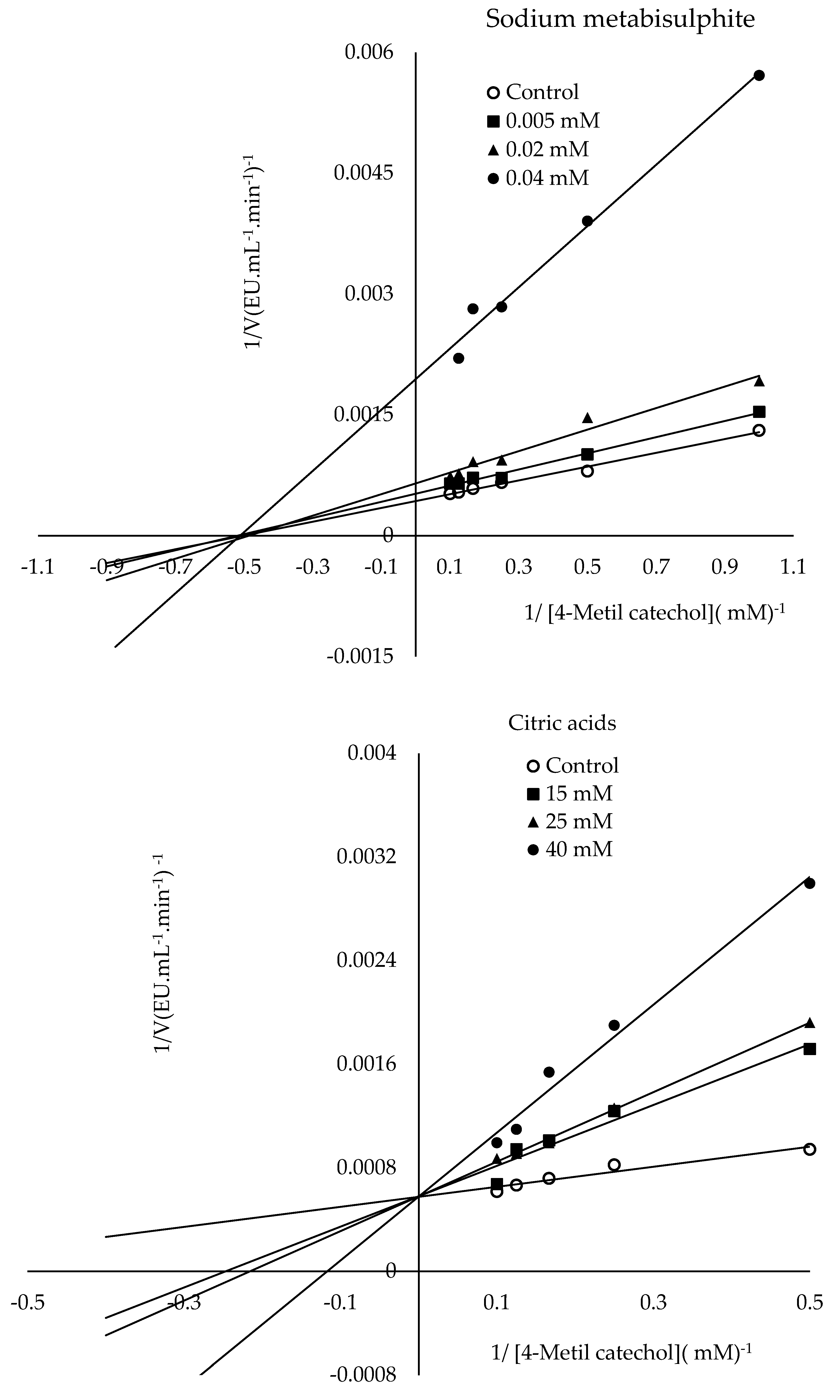 | Broccoli (Brassica oleracea var. botrytis italica) florets | 4-Methylcatechol | Ascorbic acid | - | 8.8 × 10−2 | Noncompetitive | [61] |