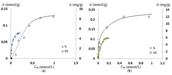 The Langmuir, Freundlich, and Dubinin–Radushkevich models [31,40,41,42] were used to describe the adsorption. The type of isotherms obtained is closest to Langmuir adsorption isotherms. Figure 6 shows the linear forms of Langmuir isotherms of G and GS of Cu(II) (a) and Ni(II) (b) ions.