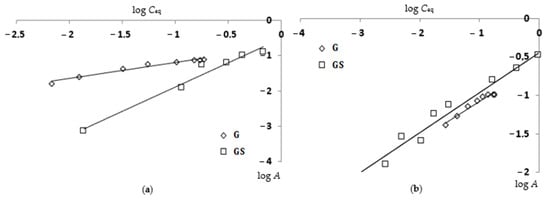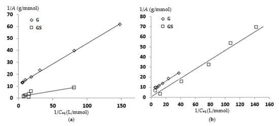 The characteristics of the Langmuir isotherm of G and GS can be expressed by a dimensionless constant known as the separation coefficient (or equilibrium parameter) RL. Adsorption is considered irreversible when RL = 0, favorable when 0 < RL <1, linear when RL = 1, and unfavorable when RL > 1 [49]. The maximum adsorption value, A∞, was determined by the length of the line segment intersecting the y-axis. The adsorption equilibrium constant K was determined by the tangent to the slope of the line. The values are given in Table 2.