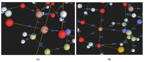 Modification of the aluminosilicate structure with N,N′-bis-(3-triethoxysilylpropyl)thiocarbamide S weakens the bond between the oxygen and calcium atoms. This increases the desorption capacity of calcium ions, promoting the subsequent adsorption of Cu(II) and Ni(II) ions (Figure 11).