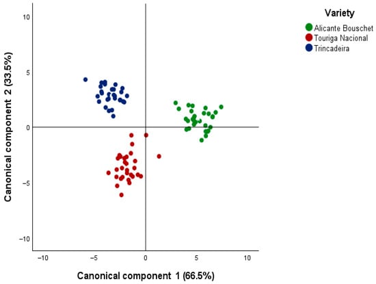 When CDA was applied to discriminate wines according to grape variety, two canonical functions were obtained, explaining 100% of the total variance, with the first function explaining 66.5% and the second one explaining 33.5% of the total variance among varieties. Canonical correlations were again high (0.967 and 0.938), with Wilks’ lambda values of 0.08 and 0.120 (p < 0.001) confirming the model’s strong discriminative power. The scatterplot of functions 1 and 2 (Figure 2) revealed distinct clustering of Alicante Bouschet, Touriga Nacional, and Trincadeira, with no overlap between groups, in spite of some differences found among wines’ oeological parameters (Table S2 Supplementary file).