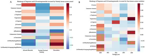 The heatmap analysis of the terpene and C13-norisoprenoid dataset (Figure 3) revealed clear differentiation patterns both by grape variety and by vintage year, reaffirming the significance of both terpenoids and norisoprenoids as complementary markers of aromatic typicity in young Alentejo wines. Regarding the varietal effect (Figure 3A), Touriga Nacional was characterized by higher relative abundances of monoterpenes such as 3-carene, terpinolene, γ-terpinene, and α-farnesene, compounds strongly associated with floral and aromatic notes, consistent with its well-recognized typicity [15,17]. Trincadeira, in contrast, exhibited sesquiterpenes, including α-copaene, β-guaiene, and β-bisabolene, which are associated with earthy, spicy, and resinous aromas, contributing to its more complex and structured aromatic profile [18]. Meanwhile, Alicante Bouschet, although less abundant in floral monoterpenes, displayed significant levels of d-limonene and eucalyptol, reinforcing its citrus freshness and herbal nuances, consistent with its fruit-driven typicity. In addition, some C13-norisoprenoids identified in this study, namely Naphthalene, 1,5-dimethyl-, β-Selinene, and Naphthalene, 4-isopropyl-1,6-dimethyl, also displayed varietal clustering, suggesting cultivar-dependent differences in carotenoid degradation and secondary metabolite pathways. Although their direct sensory impact is less well studied than that of well-known norisoprenoids such as β-damascenone or β-ionone, their occurrence reinforces the relevance of norisoprenoid metabolism as a contributing factor to varietal typicity and vintage modulation in wines [26,27].