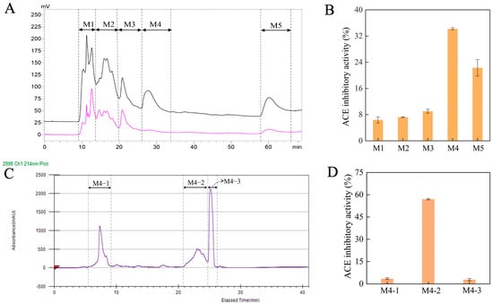 (A) Chromatogram profiles for the ultrafiltration fraction (MW < 10 kDa) of Se-enriched oyster hydrolysate acquired by preparative RP-HPLC at the absorption wavelengths of 214 nm (pink curve) and 280 nm (black curve); (B) the ACE inhibitory activity for the fractions of M1, M2, M3, M4 and M5 estimated at 1.0 mg/mL; (C) chromatogram profiles for the M4 fraction by preparative RP-HPLC; (D) the ACE inhibitory activity for the fractions of M4-1, M4-2 and M4-3 measured at 1.0 mg/mL.