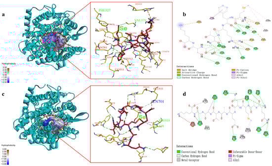 As shown in Figure 3a,c, the optimal docking conformations of ACE and peptides SeMFRTSSK and QASeMNEATGGK support the formation of stable complexes. The corresponding interactions and active sites are tabulated in Table 3.