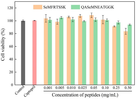 EA.hy926 cells were cultured according to the previously established method by Zheng et al. with some modifications [45]. Typically, EA.hy926 cells were first inoculated onto the DMEM supplemented with 20% FBS and 1% penicillin/streptomycin in an incubator (5% CO2, 37 °C). The resultant EA.hy926 cells were seeded into a 96-well plate (1 × 105 cells/100 μL/well) for an adherent culture of 24 h; after which the culture medium was discarded. In the peptide treatment group, cells were incubated with 100 µL of Se-enriched oyster-derived ACE inhibitory peptide at a series of concentrations (0.001, 0.005, 0.01, 0.025, 0.05, 0.1, 0.25, and 0.5 mg/mL). The blank control group was incubated with the medium, while the positive control group was incubated with captopril. After a culture of 24 h, the cell viability was determined by the MTT assay as described by Mosmann [46]. Briefly, the resultant cells were washed with PBS and then incubated for another 4 h under 100 µL of MTT solution (0.5 mg/mL). Thereafter, the MTT solution was replaced by 100 µL of DMSO and oscillated for 10 min to fully dissolve the blue-violet crystals. The absorbance at 490 nm was measured to evaluate the cell viability using a microplate reader (EnSpire 2300, PerkinElmer, Waltham, MA, USA).