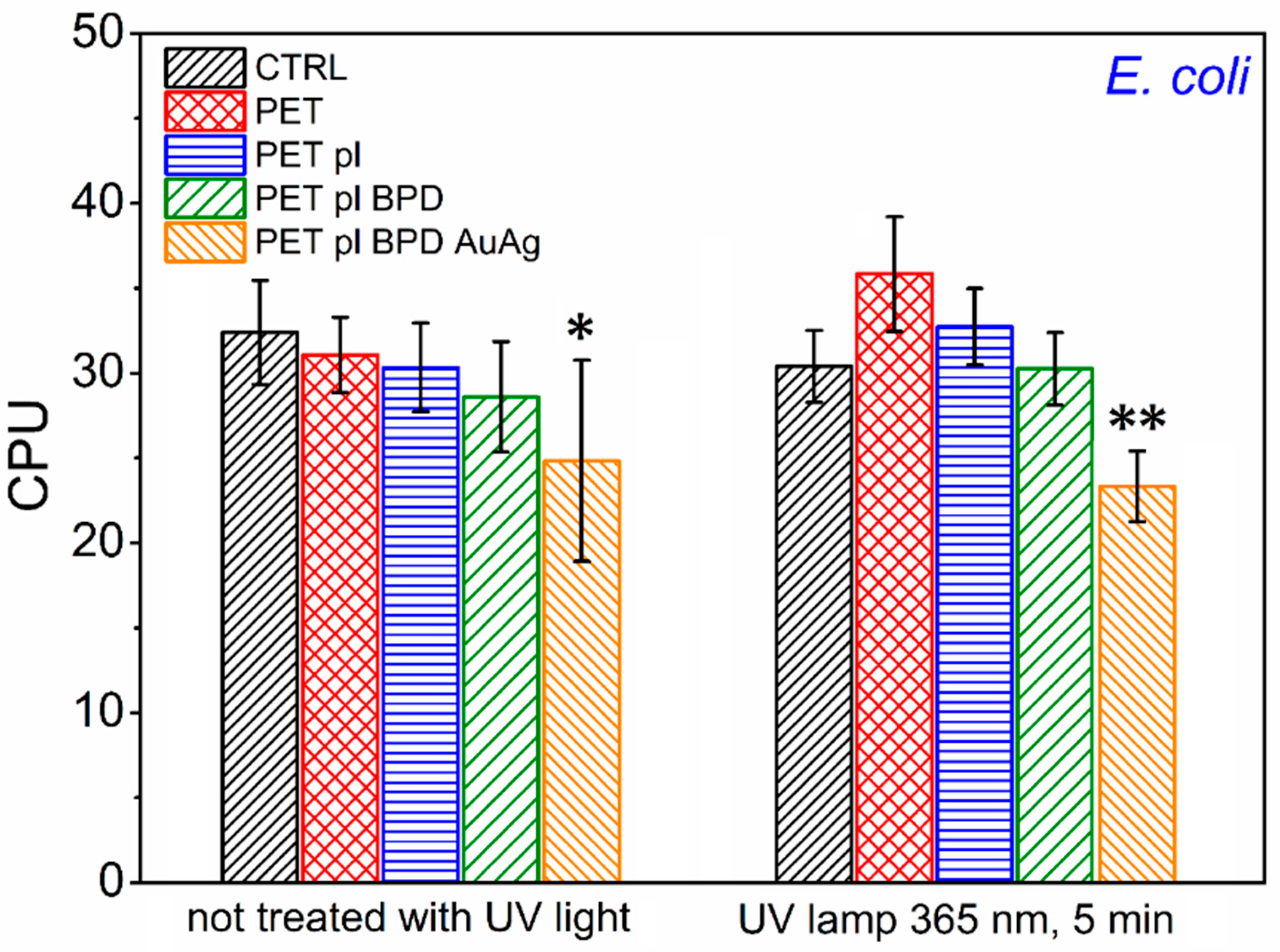- Lacmanová, V.; Ostruszka, R.; Petr, M.; Slepička, P.; Průša, F.; Kvítek, O.; Kutová, A.; Řezníčková, A.; Šišková, K. Photo-Activated Antibacterial Effect of Bimetallic Nanocomposite Grafted on Modified PET Substrate. Next Res. 2025, 2, 100996. [Google Scholar] [CrossRef]