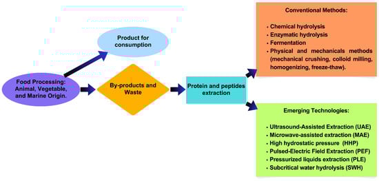 Biochemical hydrolysis is the most common method used to improve protein extraction and protein hydrolysis, thereby obtaining hydrolysates or bioactive peptides. However, emerging technologies such as Ultrasound-Assisted Extraction (UAE) or sonication extraction, Microwave-Assisted extraction (MAE), High Hydrostatic Pressure (HHP), Subcritical Extraction Water (SEW), and Pulsed Electric Field (PEF) (Figure 1) are being developed to reach higher yields of hydrolysates or peptides and to lower costs. However, studies on the effect of food by-products on protein production, hydrolysates, or peptides remain limited (Table 2).