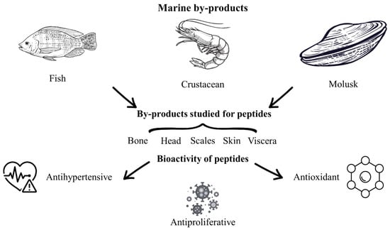Since ancient times, the primary source of protein has been of animal origin, not only for its nutritional contribution but also as an essential source of peptides, which can have different biological functions. The primary sources of these proteins and peptides are milk, eggs, and meat [13,77]. Derived from the consumption and processing of food, particularly from proteins of animal origin, numerous by-products are generated, which have proven to be a significant source of peptides with bioactive properties (Table 3) [78].