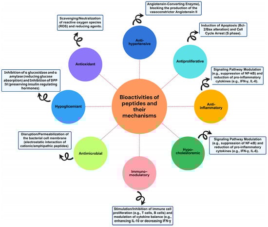 Peptide studies have been extensively explored, and bioactive peptides offer various health-promoting benefits that extend beyond basic nutritional needs. According to the order and frequency of biological functions reported, they can function as food enhancers, food additives, as well as hypoglycemic, antibacterial, antihypertensive, antioxidant, and anti-inflammatory agents. Additionally, they can act as immunomodulators, antimicrobials, antiproliferative, and hypocholesterolemic agents [1,2].