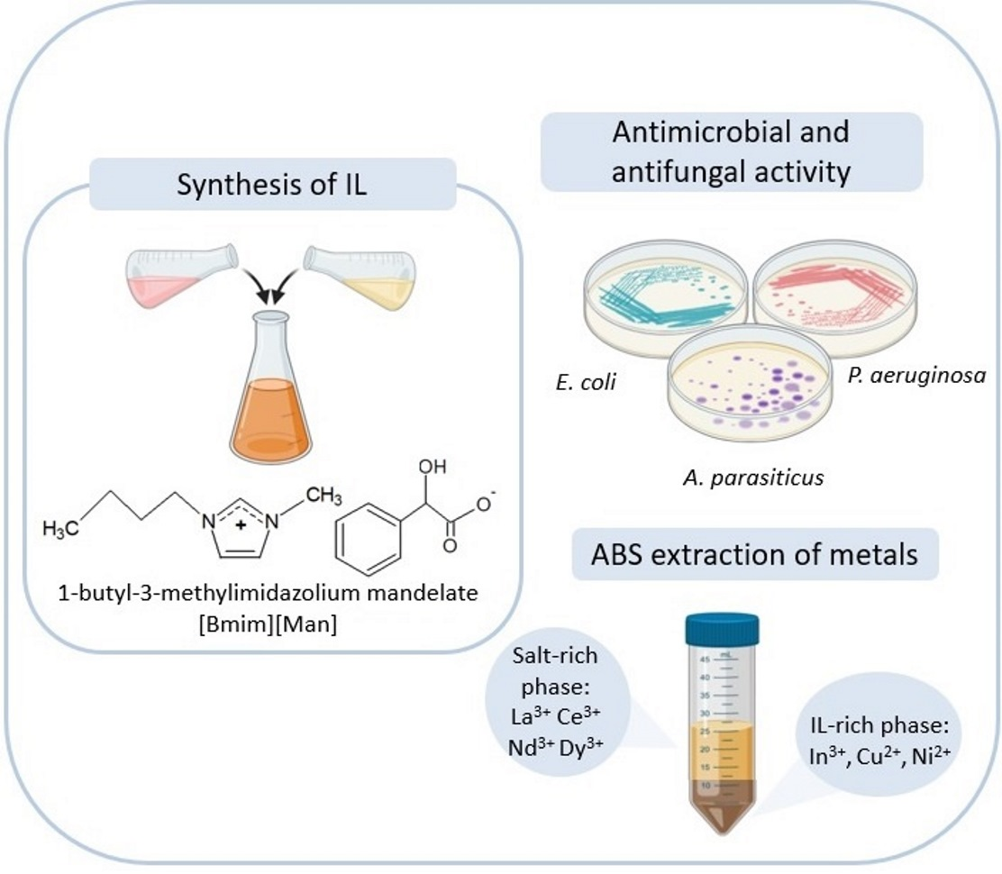 - The preliminary results on metal extraction using [Bmim][Man]-based ABS show a selective partitioning behavior for different transition metals, highlighting its potential as a designer solvent in separation processes, which is directly correlated to the complexation strength of these metals with the mandelate anion.
