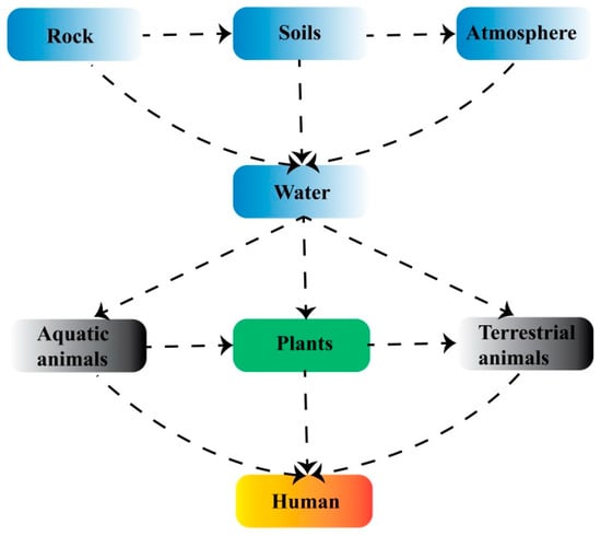 Selenium (Se) is an essential trace element that plays a significant role in maintaining human health and preventing disease [1]. Se deficiency can impair antioxidant defense systems, immune function, and thyroid hormone metabolism and contribute to disorders affecting neurological and endocrine functions and cardiovascular health as well as Keshan and Kashin–Beck diseases [2,3]. In the natural environment, Se primarily exists in two chemical forms: organic and inorganic. Inorganic Se further exists in different forms, including selenate (SeO42−), selenite (SeO32−), selenide (Se−), and elemental Se (Se0) [4]. Among these, SeO42− is the predominant inorganic Se compound found in nature. Organic Se is primarily represented by selenoamino acids, such as selenomethionine (SeMet) and selenocysteine (SeC), where Se substitutes sulfur (S) in the structures of methionine (Met) and cysteine (Cys), respectively. Additionally, methylselenocysteine (MeSeCys), which contains a methyl group along with Se replacing S, has been recognized as a major source of naturally occurring organic Se in plant-based foods for over a quarter of a century [5]. Figure 1 shows an overview of the transfer of Se from the environment to humans.