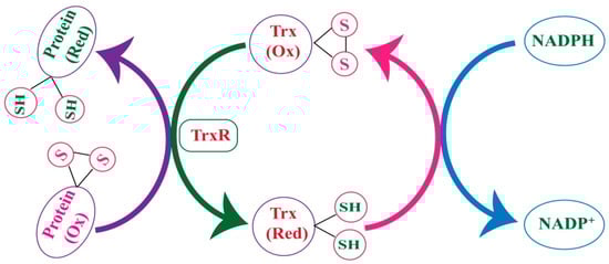 Thioredoxin reductases (TrxRs) are enzymes from the pyridine nucleotide disulfide oxidoreductase family, with a molecular weight of approximately 12 kDa, and play a central role in reducing thioredoxin (Trx). Together, TrxR and Trx form a key antioxidant system that helps maintain cellular redox balance. This Trx system, which includes TrxR, Trx, and an electron donor in the form of NADPH, operates through a disulfide–dithiol exchange mechanism to regulate its antioxidant functions [46] (Figure 4). In mammals, three types of TrxRs have been identified. TrxR1 is located in the nucleus and cytoplasm [47], TrxR2 is found in mitochondria [48], and TrxR3 is found in the testis [46]. The entire Trx system relies on NADPH, driven by NADPH-dependent oxidoreductases, primarily cytosolic TrxR1 and mitochondrial TrxR2. Additionally, the system is Se-dependent because these enzymes are selenoproteins, meaning they contain a catalytic SeC residue. Moreover, these enzymes undergo splicing, producing different variants that alter their N-terminal regions.
