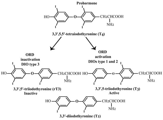 Iodothyronine deiodinases (DIOs) are a family of enzymes essential for regulating thyroid hormone levels and metabolism in the body. There are three types of DIOs: DIO1, DIO2, and DIO3, each with a transmembrane domain and a catalytic center containing SeC, which facilitates the deiodination process [49]. These enzymes, with a molecular weight of approximately 60 kDa, are dimeric proteins containing a transmembrane domain. They are localized in different subcellular regions: DIO1 and DIO3 are found in the plasma membrane, while DIO2 is located in the endoplasmic reticulum, near the nucleus [50]. DIOs regulate the systemic and local availability of the thyroid prohormone thyroxine (L-thyroxine, 3,3′,5,5′tetraiodothyronine (T4), which is secreted by the thyroid gland. T4 is converted into the active form, 3,3′-5-triiodothyronine (T3), by the 5′-deiodinases DIO1 and DIO2 for outer ring deiodination (ORD) [51]. In contrast, DIO3, a 5-deiodinase selenoenzyme, inactivates both T4 and T3 and generates inactive reverse T3 (3,3′,5′-triiodothyronine, rT3) or 3,3′-diiodothyronine (3,3′-T2) by removing iodine from the inner ring of T4 or T3 through inner ring deiodination (IRD) [51,52], playing a key role in reducing thyroid hormone activity, especially during development and certain pathological conditions (Figure 5). The structural analysis of DIO enzymes reveals several important features critical to their function. Key structural motifs include the βαβ-motif, typical of thioredoxin-like folds, and a PRX signature motif (Ser/Thr-X-X-SeC/Cys), which is conserved across DIO enzymes. The DIO-insertion, a specific structural element found in DIO enzymes, forms a unique loop (Loop-D), helix (αD), and short strand (βD), which align with the central β-sheet of the thioredoxin-like fold. This insertion is important in defining the enzyme’s substrate-binding site, located between the conserved His202 and Arg275 [53]. These residues are crucial for substrate recognition, with His202 interacting with the phenol group of the substrate and Arg275 binding its carboxylate. Additionally, Sec170 (or Cys in mutants) plays a pivotal role in catalysis by enabling a nucleophilic attack on the substrate to form selenenyliodide. Other conserved residues, such as His219, Glu259, and Ser167, are involved in proton transfer through a hydrogen-bond network, which also involves Glu200, Tyr197, and Thr169, ultimately facilitating the catalytic process [54]. However, due to the lack of a dimeric structure, further structural studies with full-length, membrane-associated DIO enzymes are required to understand their function comprehensively.