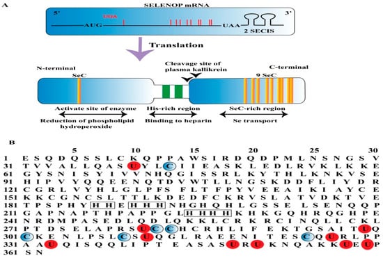 Selenoprotein P (SELENOP) is unique due to its SeC-rich domain, which requires the incorporation of several SeC residues [55]. SELENOP, primarily synthesized in the liver, plays an essential role in Se transport to key tissues, including the endocrine glands and brain, where it helps maintain optimal Se levels [56]. Most identified selenoproteins contain one Se atom in the form of SeC per molecule; however, SELENOP is distinct in that it possesses 10 SeC residues in each polypeptide, all of which are encoded using the UGA stop codon, and it comprises half of the total Se content found in plasma [57]. Figure 6A illustrates two SECIS elements in the 3′ UTR of SeP mRNA [57]. The Se content in SeC within SELENOP is divided into two fragments [58]. In the N-terminal domain, one SeC is located at the 40th amino acid position, part of a UXXC redox motif. On the other hand, in humans, rats, and mice, the smaller C-terminal domain contains up to nine SeC residues [59]. Plasma kallikrein catalyzes the limited proteolysis of SELENOP, cleaving it at the Arg-235–Gln-236 and Arg-242–Asp-243 sites. The N-terminal fragment (residues 1–235) exhibits enzyme activity, while the C-terminal fragment (residues 243–361) demonstrates Se provision activity (Figure 6A) [60]. The human SELENOP amino acid sequence is shown in Figure 6B. The N-terminal region is proposed to function as a potential catalytic center of SELENOP characterized by a UXXC motif that closely resembles the active site configuration found in Trx (CXXC). This similarity suggests the possible reactivity of SELENOP with protein thiols. Furthermore, in the interaction between the C-terminal region of SELENOP and the YWTD β-propeller domain of the SELENOP receptor, ApoER2 has been recognized as significant, particularly concerning the regulation of Se levels in the brain and testes, as evidenced by the phenotypes observed in knockout (KO) mice [61]. Both SeC and Cys residues are abundant within the C-terminal region of human SELENOP (Figure 6B) and noted for their relatively high conservation across humans, mice, and rats [62]. Additionally, the middle portion of SELENOP contains a His-rich region featuring a conventional heparin-binding motif, characterized by the XBBXB pattern, where “B” represents a basic amino acid (Figure 6A). In its native state, SELENOP is a glycoprotein containing selenenylsulfide and disulfide bridges. It possesses three N-glycosylation sites at the N-terminal and one O-glycosylation site at the C-terminal, thus classifying it as a glycoprotein. Moreover, Se-supplemented HepG2 hepatoma cells also secrete N-glycosylated SELENOP [63]. These post-translational modifications are believed to impart specific structural characteristics to SELENOP and serve to protect Se by reducing its reactivity.