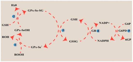 The pathway begins with the oxidation of selenol (-Se-) within GPx by peroxide (ROOH), forming selenic acid (-Se-OH). Next, a molecule of reduced GSH decreases -Se-OH to create a glutathionylated selenol intermediate (-Se-SG), releasing water in the process. Another GSH molecule further reduces the intermediate -Se-SG to produce GSSG, restoring GPX to its original selenol (-Se-) state. Subsequently, GSSG is converted back to reduced GSH by NADPH-dependent GR, with NADPH losing an electron to NADP+. Finally, glucose 6 phosphate (G6P), under the action of glucose 6 phosphate dehydrogenase (G6PD), reduces NADP+ to NADPH, completing the regeneration of NADPH essential for the reduction reactions catalyzed by GR.