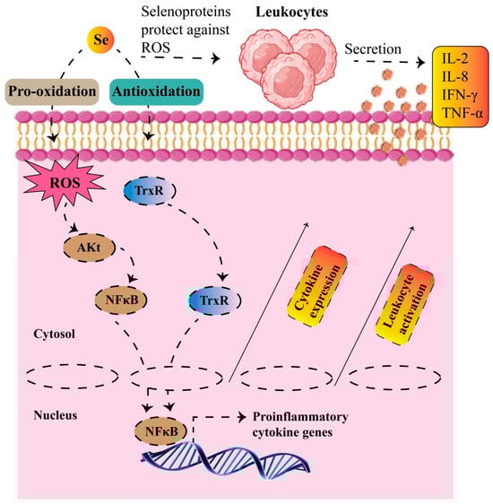 The proposed model demonstrates how Se influences the pro-inflammatory response in the tumor microenvironment and cancer cells. Se may act as a pro-oxidant, generating ROS and stimulating the Akt and NF-κB signaling pathway. Alternatively, it may function as an antioxidant by driving the synthesis of selenoproteins like TrxR, which relocates to the nucleus to activate NF-κB, thereby promoting the expression of pro-inflammatory cytokine genes and recruiting leukocytes. The proposed mechanism is adapted from [151].