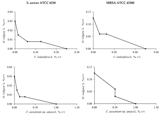 Isobolograms depicting the effect of O. vulgare L. in combination with C. ladaniferus L., C. aurantium var. amara L. and J. communis L. against S. aureus ATCC 6538 and MRSA ATCC 43300, determined by the checkerboard test and calculation of the fractional inhibitory concentration (FIC).