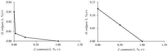 Regarding the antibacterial properties of individual EOs, O. vulgare L. showed a good inhibitory activity against S. aureus and E. coli, followed by C. ladaniferus L. In contrast, J. communis L. and C. aurantium L. var. amara exhibited lower efficacy against these bacterial strains. The results obtained for O. vulgare L. are in line with those of other authors, who highlighted the antibacterial activity of EO against both Gram-positive and Gram-negative strains [26,27]. Antimicrobial activity has also been reported for C. ladaniferus L. and J. communis L. EOs [6,28]. Concerning C. aurantium L. var. amara, the antimicrobial potential and the impact of seasonal variations on the chemical composition and biological activities of its EO have been exhaustively described [29].